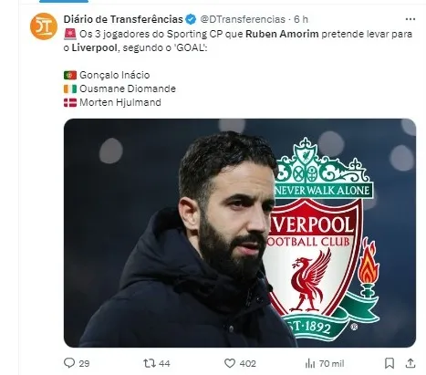 O treinador português tem interesse em trazer três jogadores do Sporting para reforçar o Liverpool, com foco especial na defesa e no meio-campo.