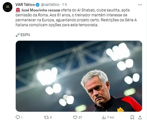 José Mourinho, o renomado treinador português, recusou recentemente uma oferta do Al Shabab, clube da Arábia Saudita, de acordo com informações da ESPN.