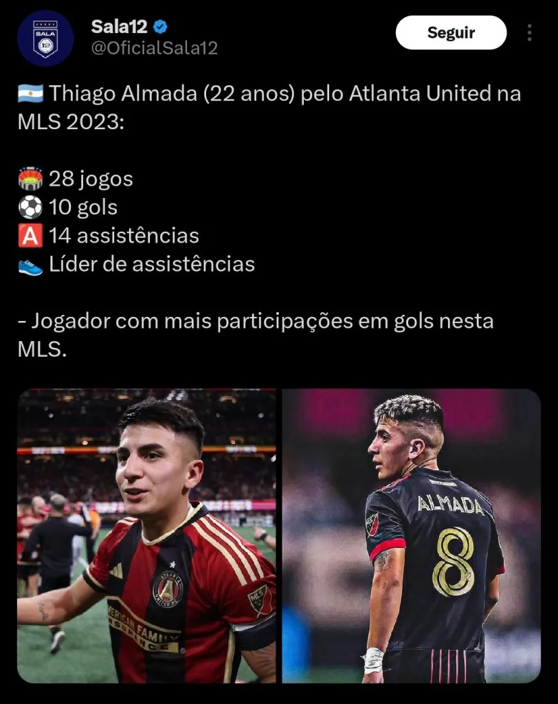 “O Almada já deixou clara a sua intenção de deixar a MLS e o Atlanta United já acenou que topa vender. Aí torcedores e pessoas que cobrem o Palmeiras começaram a especular que ele é o reforço que a Leila Pereira contratará para 2024. Chance nenhuma disso acontecer”, afirmou Nicola.