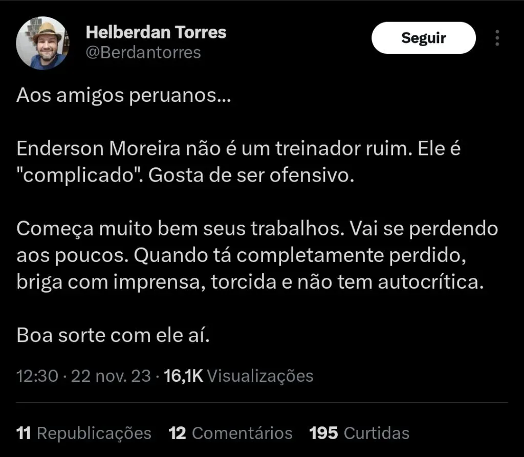De acordo com informações divulgadas pelo jornalista Denilson Barrenechea, Enderson Moreira pode ser anunciado em breve pela equipe do Sporting Cristal.