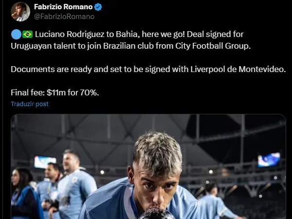 “Acordo assinado para o uruguaio ingressar no clube brasileiro. Os documentos estão prontos para serem assinados com o Liverpool de Montevidéu. Taxa final: US$ 11 milhões por 70%”, destaca.