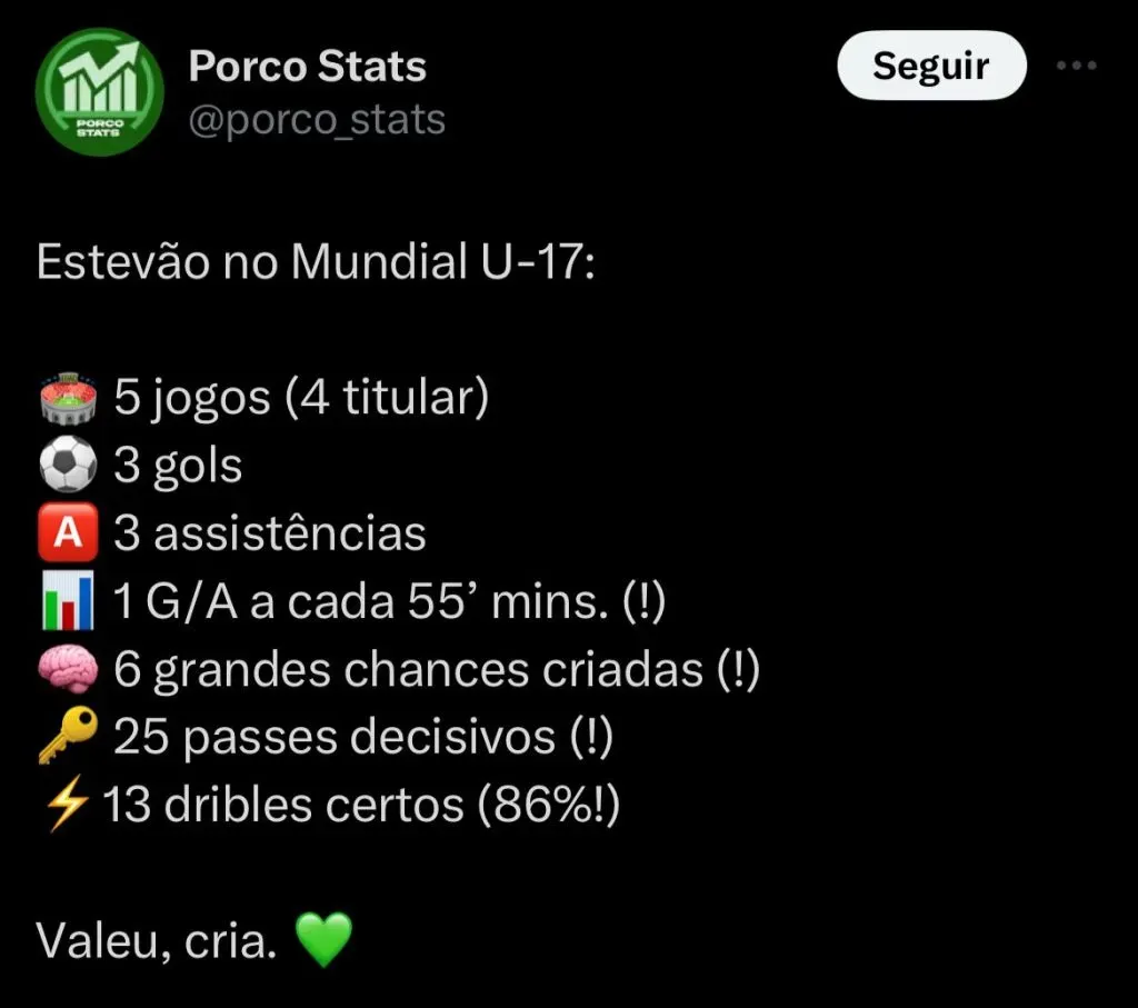 Estevão chamou a atenção recentemente após se destacar no Mundial sub-17 com a Seleção Brasileira. Além do Palmeiras, ele tem passagens pela base do Cruzeiro.