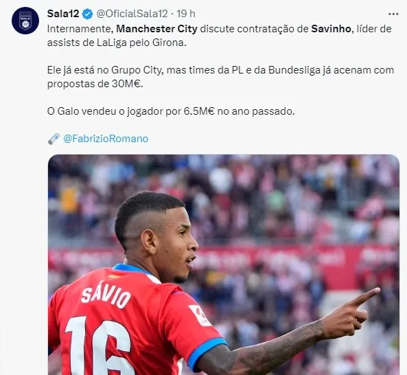 O atacante Savinho, destaque do Girona, vice-líder de LaLiga, despertou o interesse do Manchester City, de acordo com informações do jornalista italiano Fabrizio Romano, especialista em mercado da bola.
