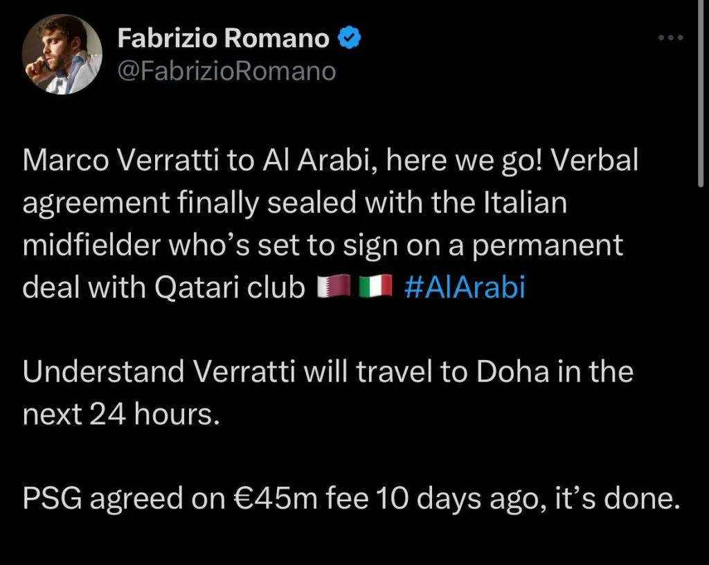 Segundo informações do jornalista Fabrizio Romano, o meio-campista Marco Verratti acertou sua transferência para o Al-Arabi.