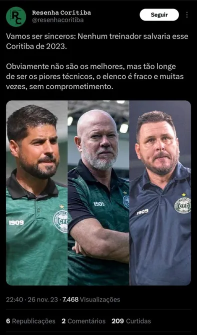 O Coritiba teve uma péssima temporada, e acabou sendo rebaixado no Brasileirão antes mesmo do término da competição. A equipe soma apenas 29 pontos, e acabou decepcionando seu torcedor.
