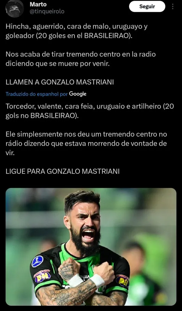 O atacante Gonzalo Mastriani foi um dos principais jogadores do América MG na última temporada do futebol brasileiro.