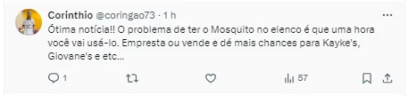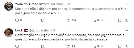 Vale lembrar que Mosquito assinou em janeiro sua renovação de contrato com o Corinthians. O antigo vínculo acabou em dezembro do ano passado e agora é válido até 30 de junho de 2026. O clube do Parque São Jorge detém 100% dos direitos econômicos do atleta de 26 anos. Veja alguns comentários nas redes sociais (SIC).