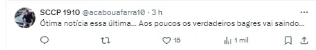 “Ótima notícia essa última… Aos poucos os verdadeiros bagres vai saindo”,