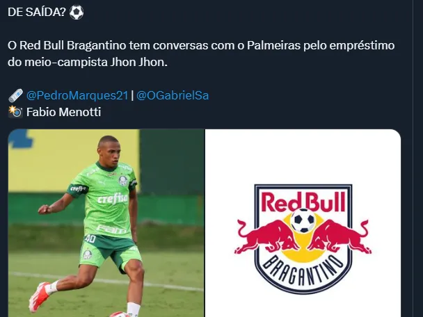 O RB Bragantino aparece como principal candidato a ser o destino do atleta formado nas categorias de base do Alviverde. A informação é dos jornalistas Pedro Marques e Gabriel Sá.