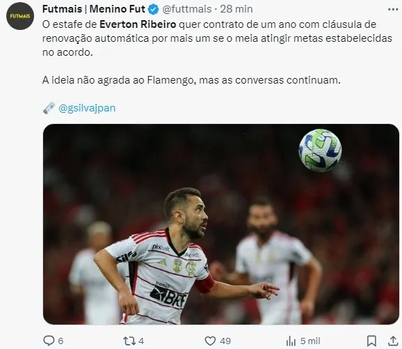 Nos bastidores, Everton Ribeiro indicou que considerará propostas de outras equipes apenas se não chegar a um acordo para renovar com o Flamengo, que permanece como prioridade.