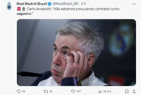 Ancelotti, que recentemente renovou seu contrato com o Real Madrid, foi enfático ao declarar que o clube não está considerando a contratação de nenhum zagueiro no momento.