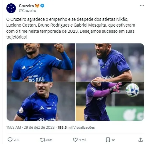 O clube mineiro utilizou suas redes sociais para se despedir de alguns jogadores, agradecendo o empenho de cada um, confirmando mudanças no elenco para 2024.