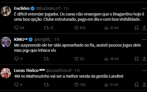 “O Red Bull Bragantino apresentou uma oferta oficial ao Flamengo para contratar Matheuzinho no valor de 4 milhões de euros, cerca de R$ 21 milhões de reais. O Rubro-Negro aceitou e queria avançar na operação”, traz Venê Casagrande.
