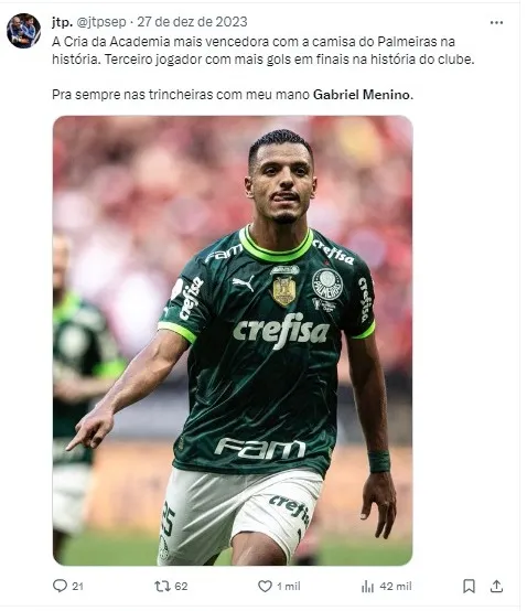 O meio-campista Gabriel Menino não deverá deixar o Palmeiras rumo ao futebol turco nesta janela de transferências, conforme revelou o empresário do jogador em resposta ao jornalista Jorge Nicola.