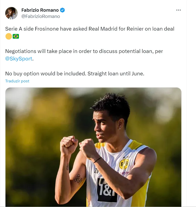Reinier pode ser emprestado em breve ao modesto Frosinone. O clube italiano, da Série A, solicitou o empréstimo do jogador ao Real Madrid, e as negociações estão em curso neste momento. A informação é proveniente de Fabrizio Romano e Sky Sports. Outras fontes, como o TNT Sports, afirmam que o acordo foi confirmado.