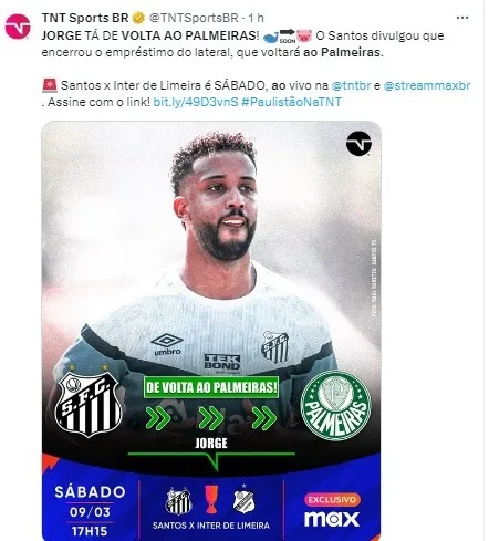 “O Santos FC informa que o lateral Jorge não seguirá no Clube e agradece todo o empenho do jogador nesse período que passou no CT Rei Pelé, bem como a parceria do Palmeiras”, escreveu o time praiano.