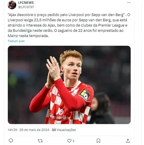 O Liverpool decidiu colocar à venda o zagueiro Sepp van den Berg, de 22 anos. O jogador, que retorna a Anfield após um período de empréstimo ao Mainz, da Alemanha, será avaliado pelo novo técnico Arne Slot durante a pré-temporada.