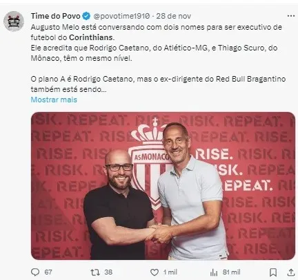 Outro nome considerado por Augusto Melo é o de Thiago Scuro, recentemente contratado como dirigente pelo Monaco, da França. No entanto, a sensação interna é que Scuro dificilmente trocará um projeto europeu para retornar ao Brasil em um curto período.