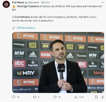 Rodrigo Caetano, diretor de futebol do Atlético-MG, sinalizou sua intenção de permanecer no Galo, contrariando as expectativas da nova diretoria do Corinthians.