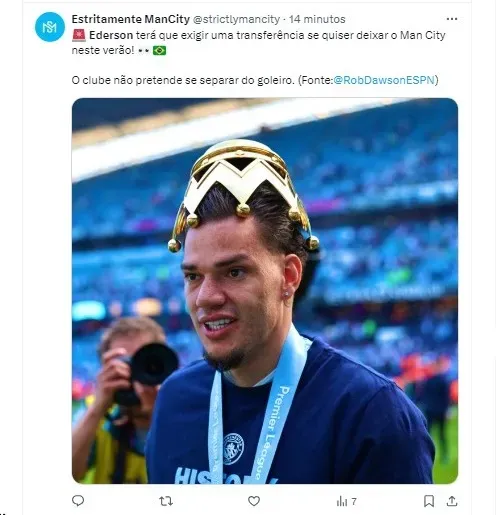 No entanto, o clube inglês deixou claro que, se o goleiro brasileiro realmente quiser sair, ele precisará solicitar formalmente uma transferência. Segundo informações publicadas pela ESPN, o City não tem intenção de vender Ederson e só considerará propostas se o jogador expressar explicitamente seu desejo de deixar o clube.