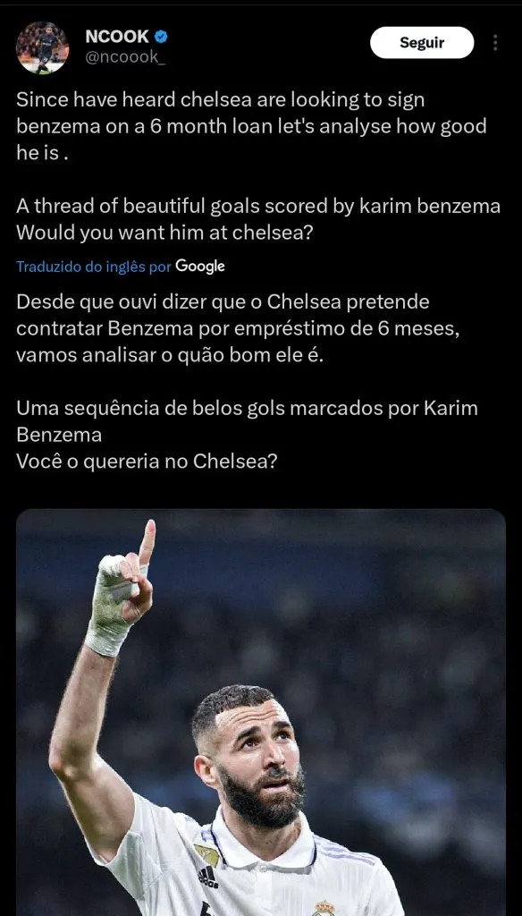 A princípio, o Chelsea pretende ofertar pelo empréstimo do francês sem a opção de compra fixada. Benzema se mostra disposto a vestir as cores dos Blues, e quer deixar a Arábia Saudita ainda nesta janela.