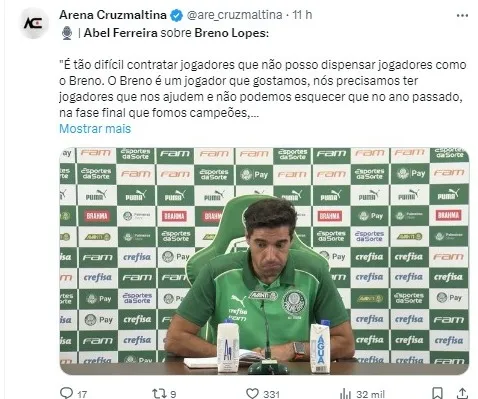 “É tão complicado contratar novos jogadores que não posso me dar ao luxo de abrir mão de jogadores como Breno”, afirmou Abel. Ele destacou a importância do atacante para o elenco, especialmente nos momentos cruciais.