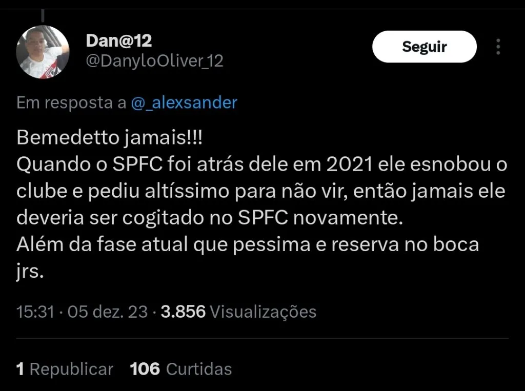 De acordo com informações do jornalista Alexsander Vieira, Benedetto foi oferecido por meio de um empresário para a diretoria do São Paulo.