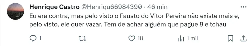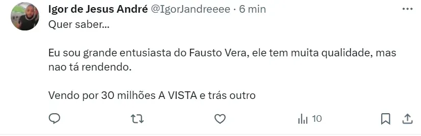 Isso porque o estafe de Fausto Vera quer tirá-lo do Corinthians. Pessoas próximas do volante, segundo informações do portal “Meu Timão”, querem vê-lo no exterior ainda nesta janela de transferências, que nas principais ligas, fecha em poucos dias.