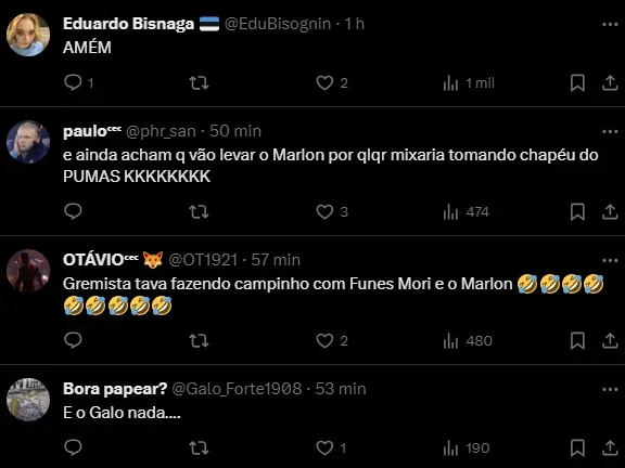 “Pumas atravessa o Grêmio e fecha a contratação de Funes Mori. O atacante irá deixar o Monterrey, mas vai continuar jogando no México em 2024”, informa o comunicador.