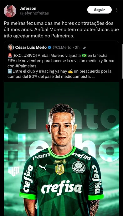 Segundo é noticiado pelo jornalista César Luis Merlo, o Palmeiras assinou um pré contrato com o meio campista Anibal Moreno, do Racing. O jogador estará viajando em breve para realização de exames e assinatura de contrato.