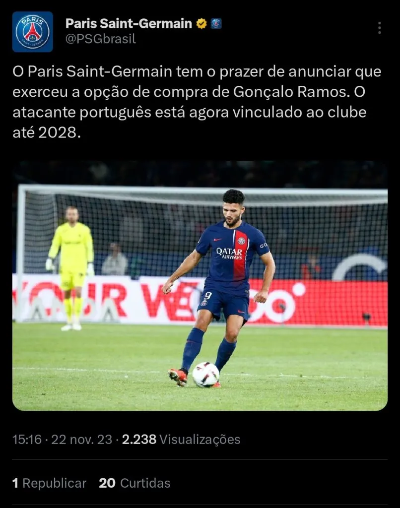 Segundo é reportado pelo jornalista Fabrizio Romano, o Paris Saint Germain resolveu ativar a cláusula de compra do atacante Gonçalo Ramos, e terá o jogador em definitivo.