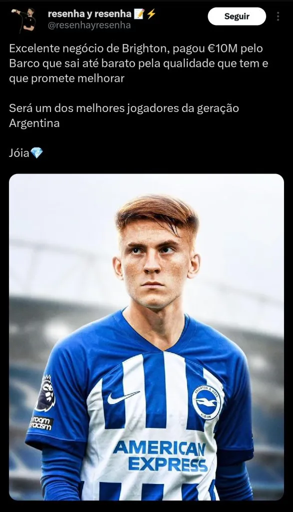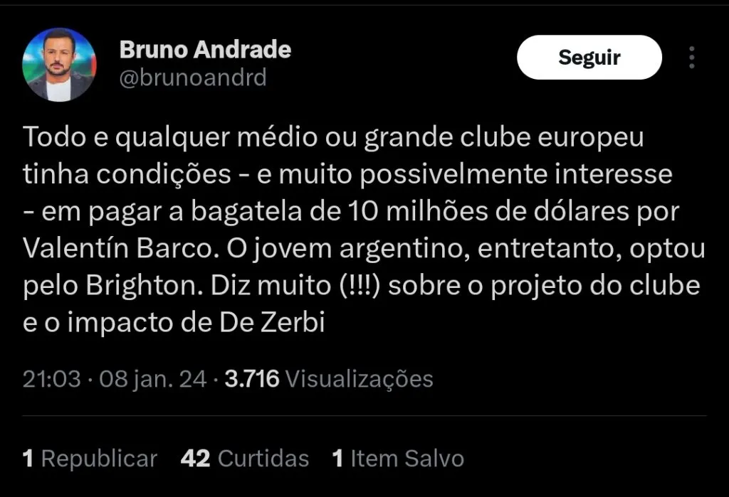 Para contratar Barco, o Brighton teve que abrir mão de um valor milionário. Fabrizio reporta que os Seagulls tiveram que investir U$10 milhões (aproximadamente R$48 milhões) pelo meio campista.