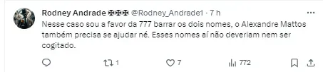 “Nesse caso sou a favor da 777 barrar os dois nomes, o Alexandre Mattos também precisa se ajudar né. Esses nomes aí não deveriam nem ser cogitado”, “Se for isso, a 777 está certa. Seriam mais 2 refugos num elenco recheado de jogadores que não resolvem nada. Seriam novos Rossi’s, David’s.” , “Liziero ou Wallisson não tem como, não elevam o nível e pra mim são abaixo do que já estão no elenco. Traz o Du Queiroz é um camisa 8 que ajuda”.