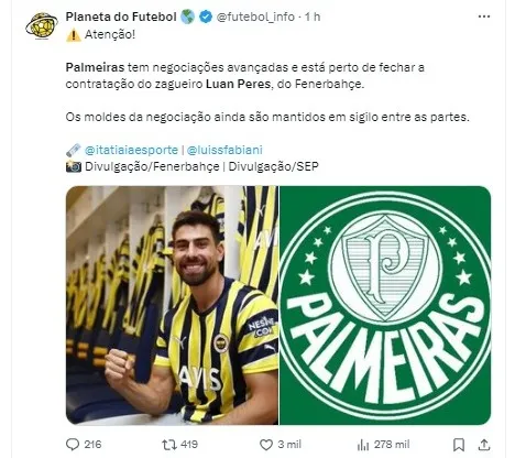 O Palmeiras continua movimentando o mercado de transferências e após a confirmação da contratação do meia Felipe Anderson, agora volta suas atenções para repatriar o zagueiro Luan Peres, atualmente no Fenerbahçe.