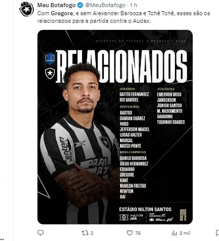 “O primeiro contato foi muito bom, as pessoas que entraram em contato comigo, o (André) Mazzuco, as pessoas que trabalham aqui que eu já conhecia me mandaram mensagens. Já acompanhava muito o Botafogo, foi muito fácil escolher o Botafogo. Pelo projeto, os jogadores que estão aqui. Não foi difícil não, foi fácil escolher o Botafogo”, disse Gregore à TV oficial do clube.