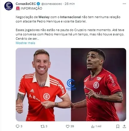 O Internacional e o Cruzeiro estão à poucos detalhes de acertar a transferência do atacante Wesley. O time gaúcho está avançando nas negociações para adquirir 50% dos direitos econômicos do jogador, que atualmente pertencem ao clube mineiro.