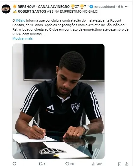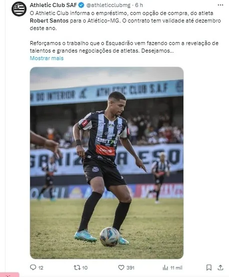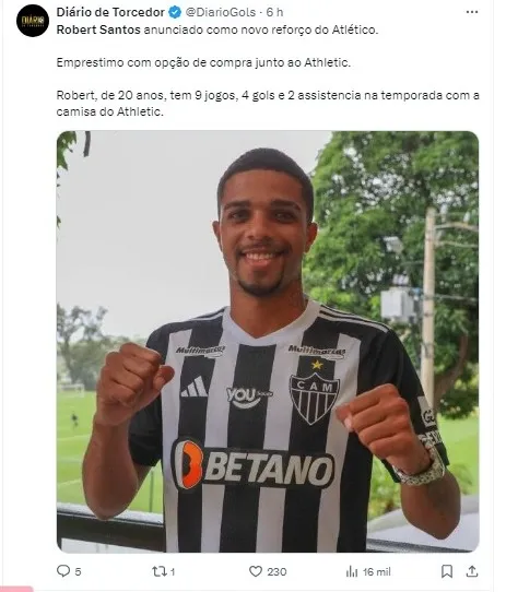 O Atlético-MG anunciou nesta quarta-feira (27) a contratação do meia-atacante Robert Santos, ex-Athletic, como seu mais novo reforço para a temporada 2024.