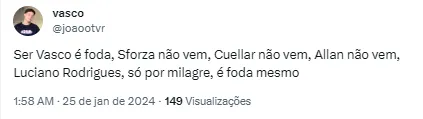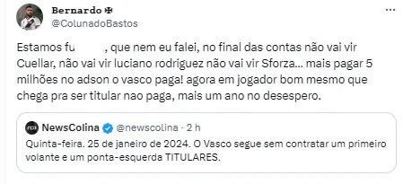 Porém, o torcedor vascaíno foi surpreendido com uma notícia desanimadora. O Vasco desistiu da contratação do volante Cuellar devido aos valores pedidos pelo Al Shabab, segundo o GOAL.