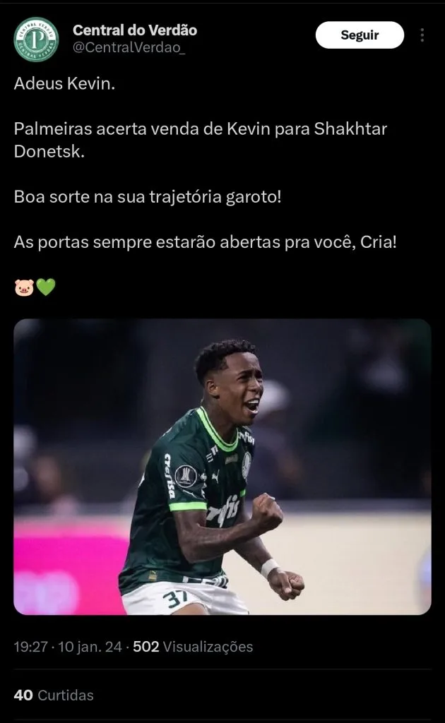 O jornalista Fabrizio Romano informa que o Palmeiras chegou a um acordo pela venda do atacante Kevin para a equipe do Shaktar Donetsk.