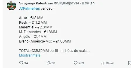 A proposta do Shakhtar Donetsk é de 12 milhões de euros (R$ 64,1 milhões) fixos, acrescidos de 4 milhões de euros (R$ 21,4 milhões) em bônus. O Palmeiras, satisfeito com a oferta, está disposto a negociar Kevin com o clube ucraniano. A decisão de transferência partiu do próprio jogador e seu estafe, que buscavam mais oportunidades de jogo em 2024.