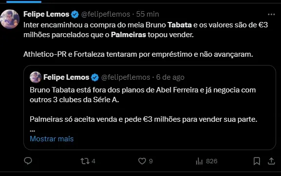 “O Nosso Palestraapurou que o Palmeiras encaminhou a saída do meia para o Internacional e apenas detalhes burocráticos separaram a oficialização do negócio”, destaca a publicação do portal palmeirense.