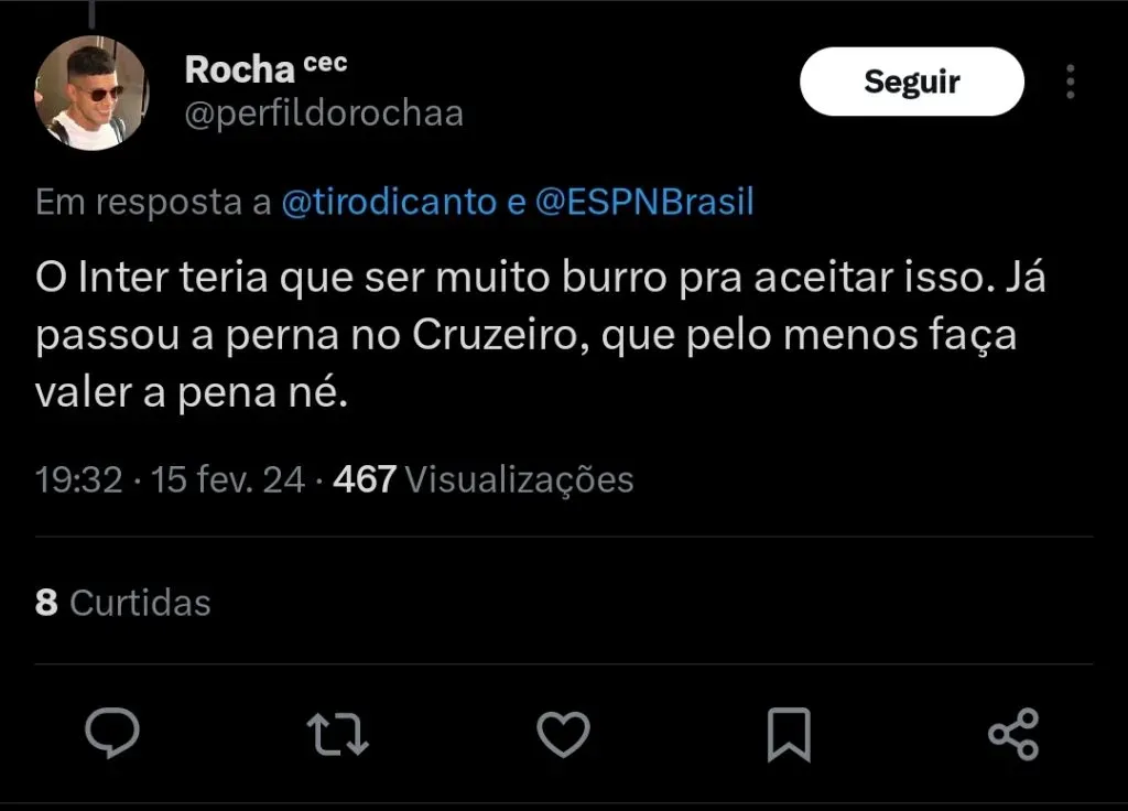 Ainda segundo a fonte, o Palmeiras está disposto a pagar €7 milhões (R$37,5 milhões) por 50% dos direitos do jogador colorado. O Internacional aguarda um valor pouco acima do especulado, algo em torno de €8 milhões.