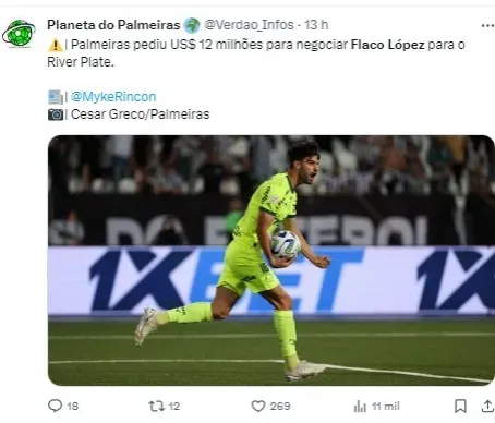 O Verdão adquiriu Flaco López do Lanús em 2022, desembolsando cerca de US$ 10 milhões na época. Agora, o River Plate teria que superar essa quantia para contar com o atacante em seu elenco.