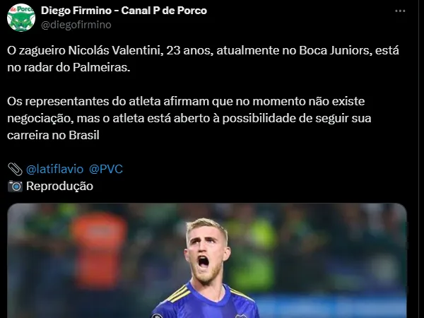 A bola da vez é o jovem Nicolás Valentini. O atleta de 23 anos é avaliado em 6 milhões de euros (R$ 34 milhões na cotação atual) e tem contrato com o Boca Juniors até dezembro.