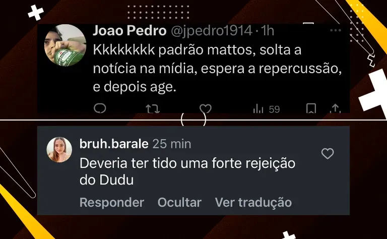 “A TORCIDA MÁFIA AZUL em nome de todos 12 milhões de torcedores do Cruzeiro Esporte Clube vem a público para expressar sua insatisfação e completa discordância em relação à possibilidade de contratação do atacante Dudu, do Palmeiras, em 2025…”, destacou em nota, mostrando o descontentamento.