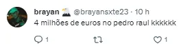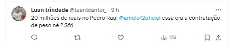 “É muita sacanagem gastar tudo isso nesse bagre”, “O time está cheio de problemas financeiros e vai pagar 20 milhões em um cara para ser reserva do Yuri Alberto. Inacreditável”, “ 20 milhões no Pedro Raul? Não é possível”, “20 milhões no Pedro Raul pq*, volta Duílio, por favor”, escrever alguns torcedores no Twitter.