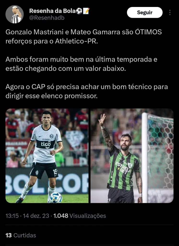 A equipe do Athletico Paranaense tem sido tem sido bastante ativa nas últimas semanas, buscando se aproveitar do mercado de transferências. O Furacão não fez uma boa temporada em 2023, e busca retomar a briga por título no próximo ano.