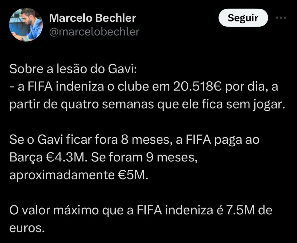 Gavi rompeu o ligamento cruzado anterior durante as eliminatórias da Eurocopa. O Barcelona tem dois nomes em sua lista além de Moscardo, são eles Guido Rodriguez, do Real Bétis, e Vermeeren, do Royal Antwerp.