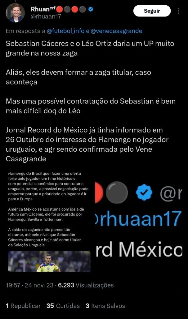 O jornalista Venê Casagrande reporta que o Flamengo tem enorme interesse em acertar a contratação do zagueiro Sebastián Cáceres, do América-MEX.