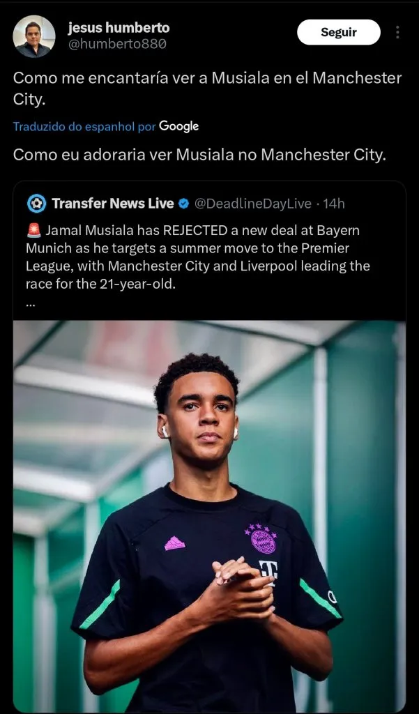 Musiala passou pelas categorias de base do time de Manchester, e gostaria de atuar na Premier League. Ele não dificultaria as tratativas, e aceitaria um retorno ao gigante inglês caso chegue uma oferta oficial.